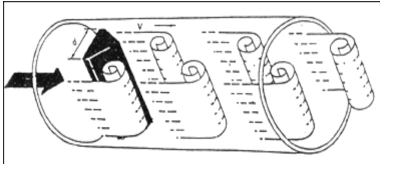 在流體中設(shè)置非流線(xiàn)型旋渦發(fā)生體(阻流體),則從旋渦發(fā)生體兩側(cè)交替地產(chǎn)生兩列有規(guī)則的旋渦,這種旋渦稱(chēng)為卡曼旋渦,如圖(一)所示。