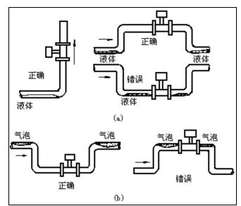 測(cè)量液體時(shí),為了保證管內(nèi)充滿(mǎn)液體,所以在垂直或傾斜管道安裝儀表時(shí),應(yīng)該保證液體流動(dòng)方向從下而上。若管道內(nèi)含少量氣體,為了防止氣體進(jìn)入儀表測(cè)量管,儀表應(yīng)安裝在管線(xiàn)的較低處